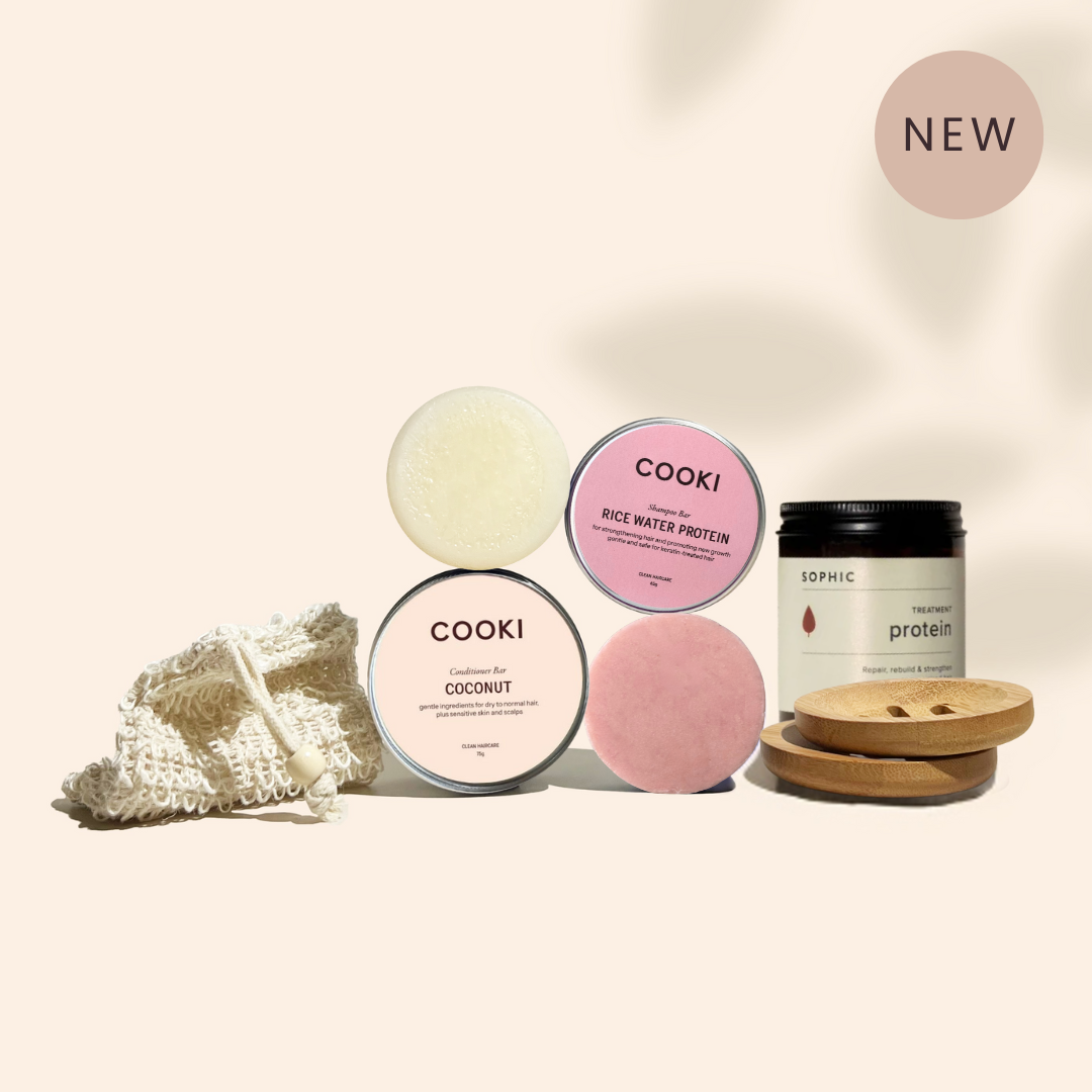 Featuring our Rice Water Protein Shampoo Bar to gently cleanse and strengthen weak or brittle hair, paired with our Coconut Conditioner Bar for deep hydration and softness. The SOPHIC Moisture Treatment adds an extra boost of protein to repair and protect your hair from future damage — perfect for hair in need of a reset.